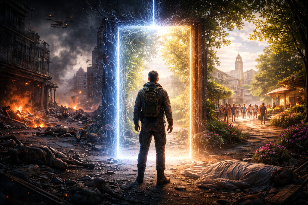 Mientras observaba el caos a su alrededor, un destello atrajo su atención. Una puerta, imposible de ignorar, apareció en medio de la calle destruida. Intrigado, el hombre se acercó y, sin dudar, atravesó el umbral.