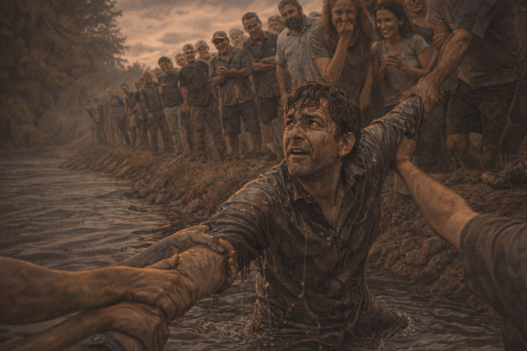 Al intentar salir, se dio cuenta de que las orillas eran demasiado empinadas y resbaladizas. La impotencia lo envolvió cuando, tras varios intentos fallidos, empezó a pedir ayuda. Fue entonces cuando vio a la muchedumbre que tanto despreciaba, la misma que ahora lo miraba con curiosidad y con una risa contenida.