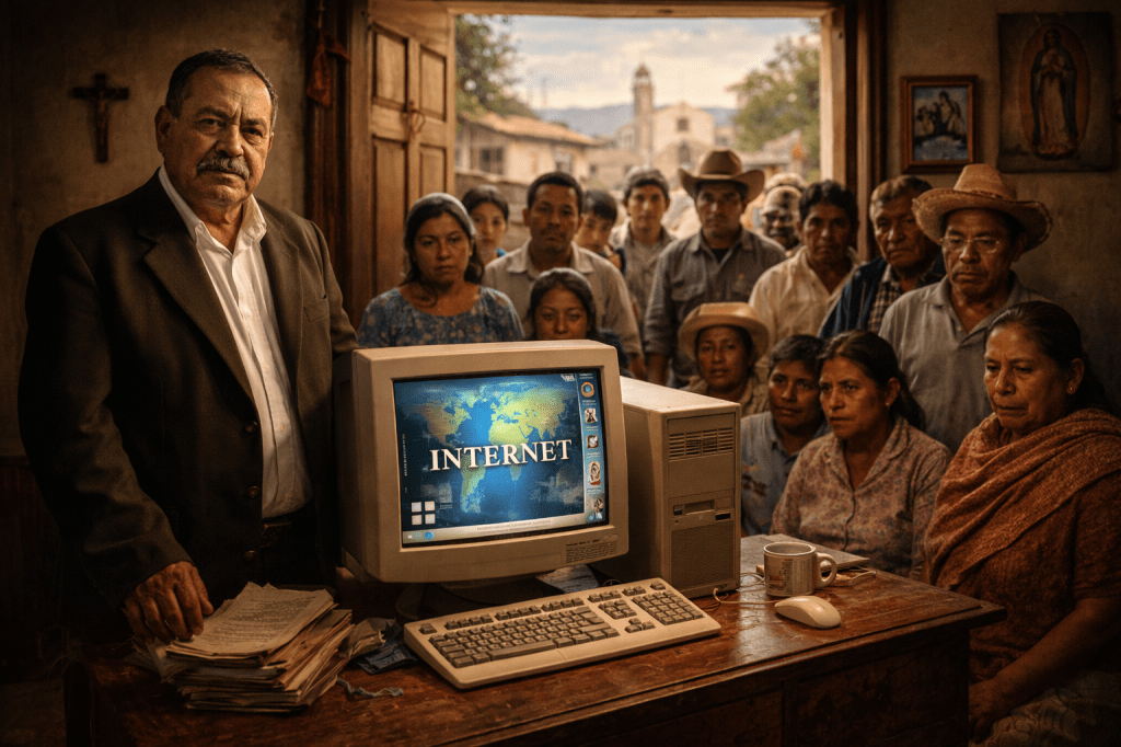 Amanecía en la pequeña población de San Bartolo en el Estado de Tlaxcala, y como siempre, los primeros en despertar eran los gallos, la mayoría de la población trabaja en el campo; Es decir, sobre los surcos de milpa o de lo que sea: vida de labrantío. Los siguientes en despertar son los habitantes, la mayoría desde las cinco de la mañana, para que la jornada diaria termine a buena hora y así se aproveche bien el día, los últimos en despertar son los rumiantes y las lagartijas friolentas. Pero no, también hay otros que se levantan tarde en las poblaciones como San Bartolo y son los caciques, ellos con su vida holgada, no necesitan pararse tan temprano, para eso tienen a sus peones y a sus sirvientas. Don Indalecio Florentino Olvera Xóchihua es un cacique autóctono cuya pureza se observa claro en su lampiñez obstinada; es todo hombre, que como un patriarca ejercita su posesión con las sirvientas y como ciudadano ejercita también sus derechos para votar. Su pose era la de un ser carnívoro dispuesto a comerse cualquier ciervo descuidado. El cielo parece borrego en plena trasquila, con un tono punzó en el orto. El paisaje se observa mestizo con un lampo murmurante sobre las tejas más nuevas y sobre el jagüey de la descampada de la “Santa Cruz”. El pequeño pueblo tiene un característico olor a gallinaza, a eso se le va sumando el tufillo de las cocinas de humo. El tostado ambiente se acicala en el cerro Oxtotl quien tiene una neblina propia de tugurio legañoso. Se hacen exterminar todas las calamidades nocturnas que se escucharon por distintos lugares a lo largo de la noche. ¡Pero qué delicia el sentir ese su aniquilación! La belleza grotesca y sin ningún pudor se presenta en la campiña; los matices basándose en lombrices tonales: nogal, ayacahuite, sabino; En los madroños, cerca de la casa de Don Indalecio, hay un nido al cual le chifla el aire por entre las ramitas, no tardará en caerse con todo y huevos. El rododendro felizmente presume su hermosura sin recato alguno, está en el jardín que cuidan con esmero los sirvientes. Don Indalecio déspota como la mayoría de los que tienen el poder o puesto público por muchos años; se vanagloriaba de haber pertenecido a los muchachos corajudos y revolucionarios del 68; de aquello le quedaba el recuerdo de ver morir a muchos en la plaza de las tres culturas, ahora no le resultaba más que recordarse con una mueca, como un chamaco pendejo que creía en ideales injertados, verdes, candorosos; ahora se pensaba —“gracias a Dios”— muy lejos de aquellos años. Don Indalecio al paso del tiempo le hizo un guiño al hedonismo, aprovechó que era abogado, se sirvió de que el ronquido de ignorancia era permanente y casi hereditario en los indios, así como también se valió de su carácter el cual no se amilanaba ante nada, y de que carecía de esa compasión que pedía Jesucristo ante sus escuchas. Por tanto, sus ideales comunistas enflaquecieron en tanto que su patrimonio engordó tanto como las vacas que José hijo de Jacob pronosticó al faraón. A las diez de la mañana llegó el vendedor. El comerciante era gordo, barba canosa de candado, pómulos salientes, cabello entrecano y lacio, chaparrón y un poco zambo; lentes, zapatos con suela de goma, pantalón negro, saco verde olivo, movimientos ágiles a pesar de su abdomen, Don Indalecio esa mañana compraría una computadora con un dinero que le había llegado por la venta de un terreno, sus ganas por comprar ese “aparatucho” era sólo para presumir con el montón de compadres, porque eso de saber de Internet y procesadores pues ni jota. En los arreglos de compraventa de la computadora, el cliente añoraba que su categoría social aumentara mientras que el comerciante perseguía que ese individuo se llevara el producto embodegado y que así aumentaran sus ganancias. Pero Don Indalecio sabía que «A mucho decir, mucho mentir”. Y no iba a dejar que le mangoneara el asunto así que pago lo suficiente haciéndose un descuento del cinco por ciento por “costos de operación”. Don Indalecio sabía que a la gente se le juzgaba por sus bienes, se le valoraba de esa manera, por eso cada vez repetía: —Y sí que sabes tú… “Cuanto vales cuanto tienes” y si no veme a mí. Antes de encender la máquina pide que se congreguen algunos parientes y sirvientes para que le echen agua bendita del templo de Juquila y le recen algunas jaculatorias, eso para que Dios no permita que llegue a la pantalla alguna que otra imagen licenciosa. Algunos le han dicho que para que se acelere el disco duro hay que ponerle unos imanes extras. Pero él no hace caso, repite, como cualquier pelafustán —“Mientras en mi casa estoy, rey soy”—Nadie entiende el uso de ese aparato, tienen la idea de que es una televisión más, pero con más “difinición”, la sobrina aconseja —Pos la ha comprado porque dicen que tiene juegos como “el solitario” y “las busca minas” en donde se puede divertir uno ¡a lo grande! — El monitor se les queda viendo que si hablara les diría: “bola de orangutanes”, ¡mamíferos de pacotilla! Se les veían las mismas facciones bárbaras que tenían las hordas hitlerianas en la quema de libros contrarios al partido nazi. Otra comadre de él, Beatriz una indita religiosa, ignorante y con dinero se había comprado también una computadora porque le habían dicho que Dios había puesto su página en Internet y ella quería comunicarse con Él para agradecerle distintos favores. Los hombres del pueblo desanimados, parcos en el habla, sumisos ante el patrón. Su voluntad era la que les permitía estar firmes, persistencia que sumaba años en el mismo sendero. Ellos se daban esperanzas diciendo: “No hay miel sin hiel”. Los conflictos que querían resolver mellaban la anorexia, su inquietud podía resolverse o no, todo dependía de que Don Indalecio les escuchara. Él sabía bien que “Favor con favor se paga”. A Don Indalecio le