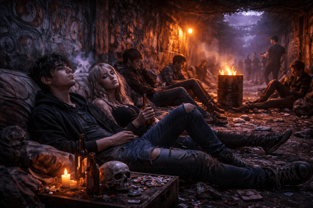 —Para que enderezarnos si nuestro espíritu es así de torcido, si en el ambiente de lo que se trata es de no pensar[1]… ¡Entonces estamos en nuestro elemento! Estemos enfundados en los enganches y las futilidades, qué hermoso este mundo de lo placentero y de lo sin esfuerzo. ¡Sí, me acobardo! Soy enclenque ¡Viva el mundo cool! Es más, nuestros desajustes ni siquiera aromatizan el ambiente, somos la nada y nos divertimos de lo lindo[2]; la benevolencia de la vida está en nuestra pose ante las cosas, significa ausencia de preocupación, olvidarse de la historia… inclusive de nuestra propia historia. Nosotros consideramos que pensar en una ideología es una cursilería, nunca de los nunca nos harían hincar ante ningún escarabajo. Para nosotros, los políticos representan sólo una manada de orangutanes capaces de atragantarse e inflar sus egocentrismos y bolsillos. Lo único que queremos es que nos dejen en paz. Esta es una sociedad demasiado encopetada con su humanidad, loa ufana y errática de la historia humana. No creemos en ese humanismo samaritano[3], sino más bien en una especie de idea moderna sobre la fatalidad, somos de algún modo, una generación como de buitre empollado por una sociedad reluciente de ambigüedades[4]. A nosotros los adolescentes no nos importa en absoluto nada, ninguna congoja arruga nuestros semblantes, todo en nosotros es piel rozagante y todo a flor de piel[5]. Pero en nosotros no hay ninguna candidez sino perversidad, elementos que traemos desde el nacimiento. La agresividad es parte de nuestra humanidad[6], dicha hostilidad está hasta en nosotros mismos, el dolor del cuerpo es un ejemplo muy vivo, dicha agresividad la aceptamos como inherente en nuestro espíritu. El mundo exterior tiene fuerzas destructoras e implacables, ya nos cansamos de estar siempre a la defensiva[7], ir a contracorriente, la pose ante el mundo entonces es la que ya dije anteriormente, el entorno de la trivialidad, pero sin olvidar que somos naturalmente agresivos y lo aceptamos como constitutivo de nuestro ser. Somos… sí crueles ¡Viva la hostilidad y la agresión!