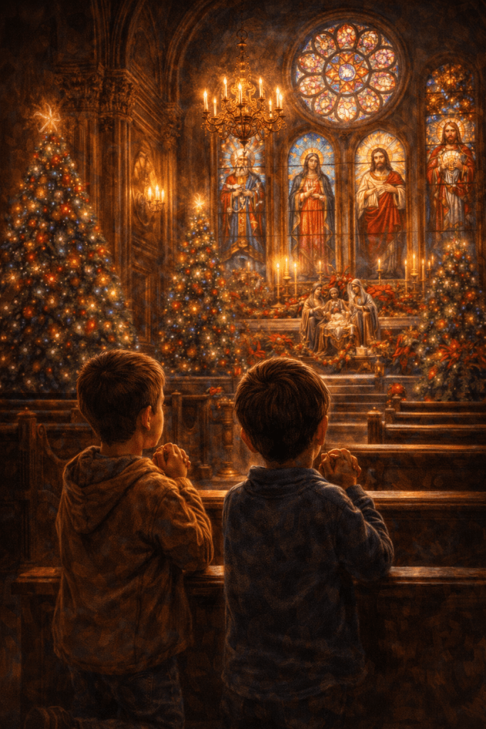 En la catedral de san Antonio de los Arenales, la madera luce su riqueza en las molduras talladas y repujadas en pan de oro. El candelabro de hierro forjado, suspendido en la cúpula central, ilumina el entorno. Sus retorcidas formas rococó recuerdan a un arácnido de un mundo fantástico. A lo alto y en torno, la cristalera con vivos colores: el vitral de San Nicolás, el vitral de San José, el vitral del Sagrado Corazón de Jesús; la vidriera de la virgen Guadalupana, el vitral de santa Teresa del niño Jesús. En la piedra con destellos blondos, el rosetón, el cual deja pasar un rayo de luz que se estampa en una de las estaciones del vía crucis. Pronto será Navidad, y la pequeña ciudad ya refleja las festividades con las espléndidas compras que realizan los cristianos. Los comercios, adornados con árboles, esferas, series de luces, Reyes Magos y otros adornos decembrinos, irradian un ambiente festivo. Es la luminosidad en algarabía, el colorido festivo —bermellón, verdemar, dorado, plateado, azul, guinda—. Las tiendas céntricas se visten de Navidad. Los niños que harán su primera comunión se han ido luego de la posada. En el atrio de la iglesia han quedado guijarros de piñata rota. La basura de cacahuetes, galletas, naranjas, cañas, tejocotes; son el panorama después de la verbena. Dentro de la iglesia, una decena de cristianos permanecen en oración, entre ellos los niños Alonso y Edgar.