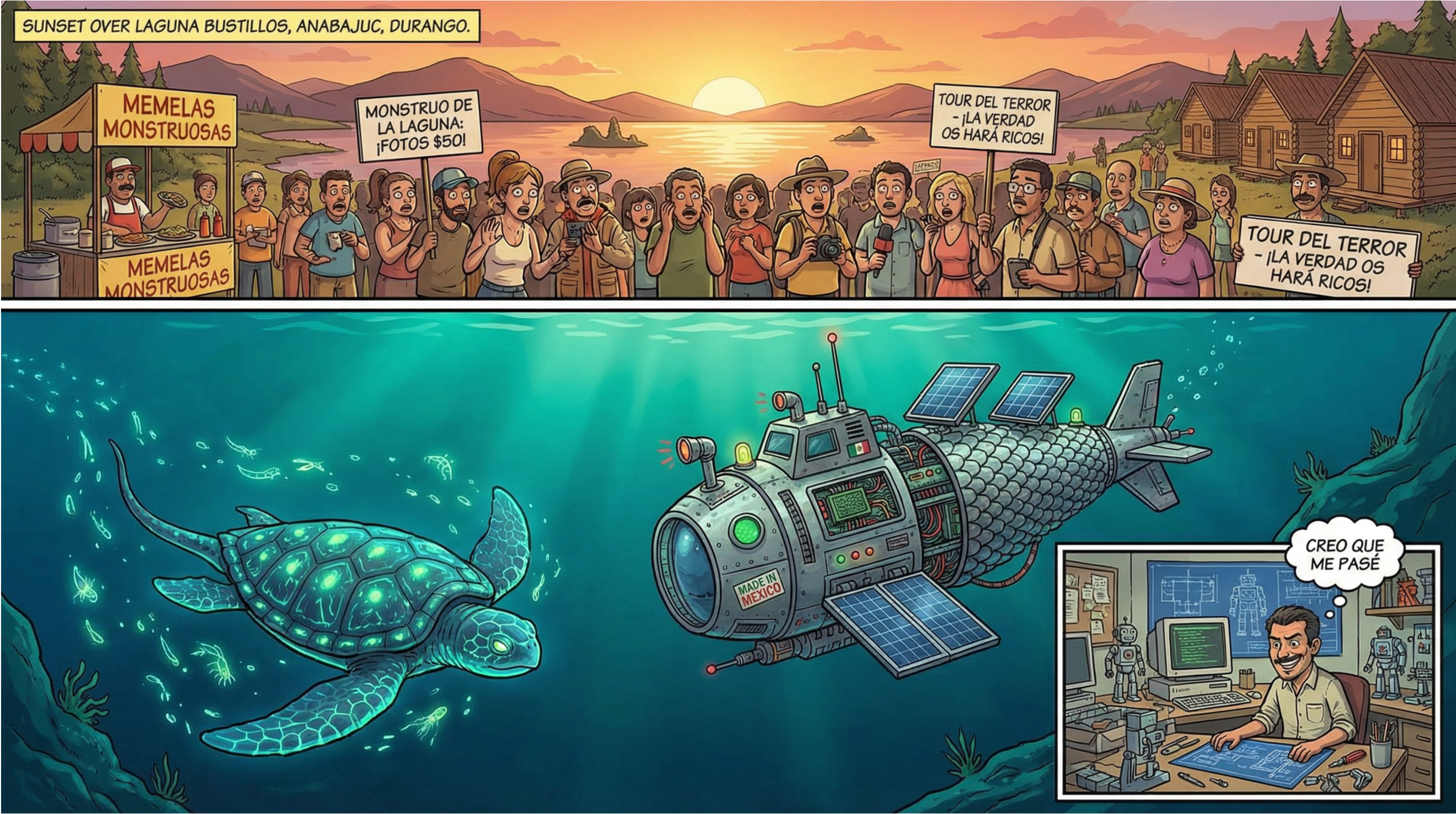 —Pues verán ustedes, yo tengo un inquilino que trabaja en “La Sulfurosa”, es ingeniero y se encarga en la fábrica de unas nuevas instalaciones en el área de repulpado. Ese ingeniero sabe mucho de máquinas y robots y de computación. Resulta que esta mañana fui a recoger un recibo de luz al departamento de este ingeniero y descubrí que tiene una maqueta de un como submarino pequeño pero que tiene escamas y por dentro tiene sistemas como los que usan los robots y equipos de electrónica. Además, me encontré con un proyecto de un robot que iba a nadar en la laguna Bustillos. En los objetivos del proyecto está el de engañar a la gente del pueblo de Anabajuc. Ahora no me negarán que yo contribuyo a resolver los problemas del pueblo, que yo soy quien muchas veces tengo que enfrentarme a este tipo de situaciones.