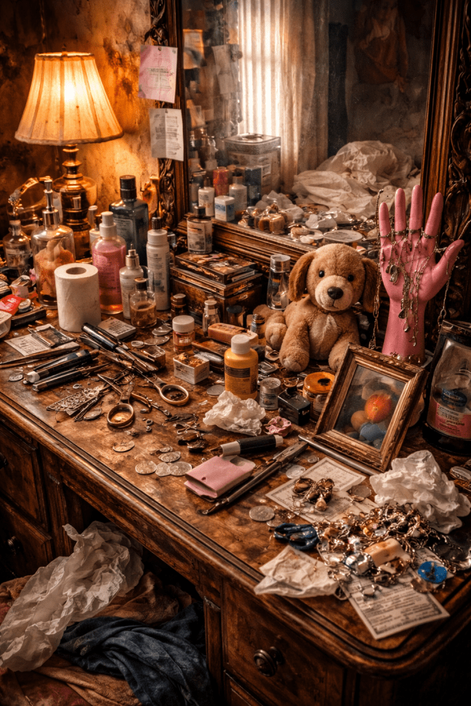 Al terminar el vaso, lo deja en el fregadero, que ya está lleno de utensilios sucios. Suspira. El desorden de su vida es tangible, pero, por ahora, no tiene energías para enfrentarlo. Se dirige a su habitación, donde su propio tocador es una réplica del que describió: lleno de objetos amontonados, recuerdos de tiempos pasados, medicinas olvidadas, y pequeños tesoros sin valor. Se tumba en la cama, agotado, y mira al techo, donde una telaraña en la esquina es lo único que se mueve, balanceada por la brisa ligera que entra por la ventana.