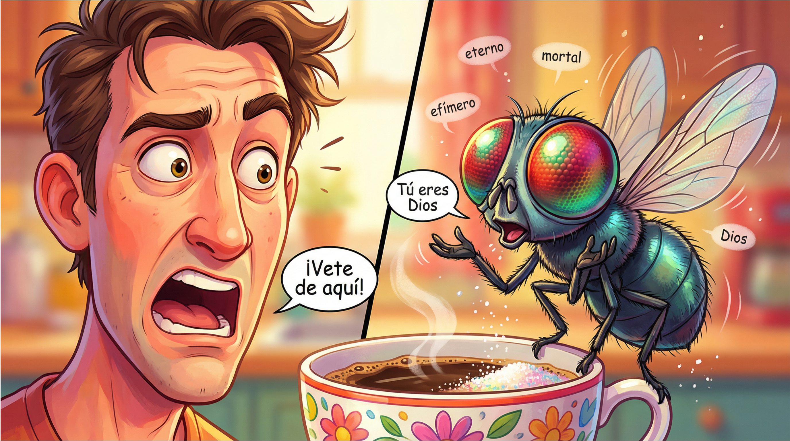 Zumbaba cerca, parecía un vuelo desesperado, con prisa, en unos aspavientos acelerados. Danzaba en el aire que respiraba, luego, la mosca se detuvo; aventurándose a comer el azúcar de la taza de café, en el borde floreado y albino. Me miró, diciendo: —Tú eres Dios. Tú eres eterno, lo puedes todo; yo soy perecedero, mortal y etéreo; navego en una realidad apresurada, por eso mi vuelo, por eso mi gesticulación volátil, por eso te molesto tanto. No me das vida, pero sí la quitas con tu propia mano. Tú eres mi Dios, el hombre es mi Dios. — ¡Vete de aquí! — Le dije — ¡Vete! Lánzate a gozar de tu vida, encontrarás en este tu universo pequeño, lo suficiente para tu existencia. Devora las semillas del segundo y no pierdas más tú tiempo. Baila sobre lo que pueda hacerte más feliz, pero no retes a tu Dios, no lo ofendas, no lo disgustes, pues encontrarás cortada tu existencia. Se alejó sin decir más, había dejado sujeta como grapa una enseñanza, ¿Le había dado aliento? ¿Qué hubiera pasado si le hubiera corregido que yo no soy ningún Dios, que era como ella: efímero, transitorio, vaporoso?