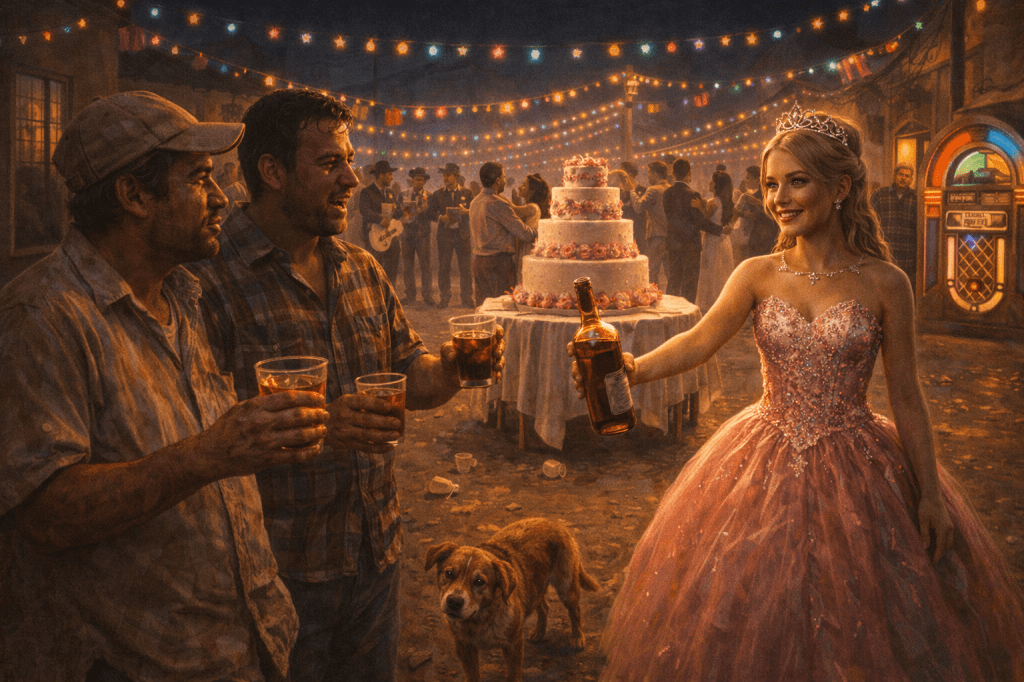 La ciudad se encuentra en éxtasis de aburrimiento permanente, las sombras de la tarde poco a poco se comen los rayos de luz que se ven filtrados en los parabrisas de los carros. El cantinero limpia la barra, con un trapo seca el área de trabajo donde ha servido el par de cubas para Rafael y Carlos. Un reloj descompuesto de fayuca adorna las paredes de la cantina “El jinete Negro”. Oscar entra y se encuentra a sus amigos. —¿Cómo están? —Saludando de mano, continúa la conversación con los ebrios, en cuanto a la música, el compacto de Pedro Infante compone la alegría. —Vengo a invitarlos a unos quince años a la Trinidad Tenanyecac ¿Podrán ir? —Nosotros vamos al mismo infierno… si es que hay copas—contesta Rafael con voz entrecortada y lengua torpe, en tanto que Carlos empina el codo bebiéndose la cuba. — ¡Cantinero! Sírvale una cuba a mi amigo Oscar —Dice Carlos secándose la boca con el brazo. Mientras el cantinero trabaja Oscar comenta a sus amigos: —Desde que estoy en las filas de los desempleados, nomás pienso en mi familia. De los precios estoy hasta el copete y mis deudas crecen y crecen. Lo que queda es olvidar por un rato todo este rollo en las fiestas. ¡Salud! —Oscar, te preocupas demasiado —contesta Rafael con ojos adormilados — ¡Chúpale! Y olvídate de lo demás… súbele a la música cantinero, esa me gusta… la de… ¡hic!, Doña Meche. Dos rondas antes de la caminera circulan en las gargantas aguardientosas de los tres amigos, poco a poco Oscar muestra en su cara los efectos del alcohol. —Me toca pagar la caminera, pero… ¡ya vámonos! El vals con la quinceañera nos espera. En la calle los tres amigos piden parada a los taxis que ni se inmutan ni se molestan por causa del vaso de plástico, que todos conocen por cuba, en manos de sujetos con caminar torpe. —Frente a San José no fallan —dice Rafael adelantando el paso casi a media calle, ocasionando las pitadas de los carros. —Pues a donde va chofer —dice Oscar- por aquí no es. Es que tengo que darle vuelta al parque para salir por Mariano Sánchez, la guerrero y después por el “Trébol”. En el trayecto, Rafael y Carlos discuten sobre el trato que se les debe tener a las mujeres. Rafael contesta: —Carlos, a las mujeres hay que tratarlas bien, tenerlas contentas por muy indefensas e insignificantes que las veas tienen su sentimiento y sufren. Si no respetas a las viejas, la estas regando, porque a la larga pagas caro lo que haces. Te lo digo por experiencia. — A mi señora la traigo cortita — contesta Carlos mientras el taxi circula por la autopista — ¡Me vale! La trato como me da la gana, y si no le gusta que se busque otro que la mantenga. —No seas bruto, la mujer por naturaleza es romántica, como la quinceañera de ahorita. No ves que son soñadoras… ¡salud! Poseen la inocencia y la candidez de que nosotros carecemos ¡hic!… ¡hic!… Al tomar la desviación, Oscar le indica por donde: — siga derecho hasta llegar a la Hidalgo, ahí se va a ver la pachanga.— tan pronto como se bajan, van a un terreno de labor a orinar y a fajarse la camisa. El conjunto toca la canción cumbiambera del momento “el diario de un borracho”, Carlos comenta: —Ya oyeron, nos dan la bienvenida — se abraza el trío y se dirige a la fiesta. La quinceañera con un vestido propio a la ocasión demuestra con su cara y su belleza el festejo y la alegría que hay en su interior. Dos conjuntos musicales y un grupo de luz y sonido amenizan desde la comida la fiesta de quince años; el pastel luce al centro de la pista-calle. La localidad disfruta de la noche fresca de un sábado de primavera que se encuentra en éxtasis de aburrimiento salvo en la fiesta. —¡Chin chin, el que no chupe y baile! — gritó el grupo al unísono, como una oración que ya de memoria se conocían. Encontraron tres sillas desocupadas y se apostaron a disfrutar. La quinceañera le ofreció a Oscar una botella de brandy, los vasos se volvieron a llenar. —Carlos, mira — Rafael señala a un grupo de muchachas esperando a que las saquen a bailar. Las muchachas de falda, de vestido, con escotes y bien arregladas, cuchichean declarando inclinaciones de gusto por los muchachos. El amenizador del conjunto musical hace énfasis en los chistes de siempre, con las frases repetidas fiesta tras fiesta. La gente se sigue riendo de lo mismo. Carlos se levanta de su asiento para pedir a una muchacha que baile esa pieza. Se tambalea y llega frente a ella; al mismo tiempo otros cuatro jóvenes le piden bailar a la misma muchacha. La muchacha titubea frente a las cinco caras de los jóvenes entre ellas la de Carlos con ojos adormilados; las cinco manos se encuentran extendidas. Escoge la mano más blanca y es la de Carlos. Las parejas salen a bailar, Carlos se bambolea con el ritmo de la cumbia y le cuesta aún más por el suelo pedregoso. Carlos le hace la plática: —Oyes linda… ¡hic! ¿Me quieres? —pero si yo ni te conozco, como se te ocurre. —es que tengo corazonada de que me… me… quieres —pos’ ni que fueras “luismi” para quererte luego. Carlos se pega contra la muchacha, su aliento se esparce por la cara de ella como vaho alcoholizado. Rafael, corpulento y de estatura, también baila muy cerca del pastel que luce como una gran copa gastronómica sobre una mesa en el centro de la pista-calle. Carlos se suelta para dejar de bailar, insiste con un torpe jalón que enfurece a la muchacha, empuja con fuerza a Carlos y va a dar con Rafael haciendo que tropiece con las piedras y caiga encima del pastel. Las patas de la mesa se vencen con el peso del hombre embriagado y los manotazos terminan con el trofeo gastronómico que ahora luce en el suelo con el asombro de todos los invitados. La quinceañera es la primera en sollozar: — ¡Hay mamá… no es posible! — y abraza a la madre que, aún sin concebir lo ocurrido, estupefacta y anonadada en el total espasmo por el suceso; atóni