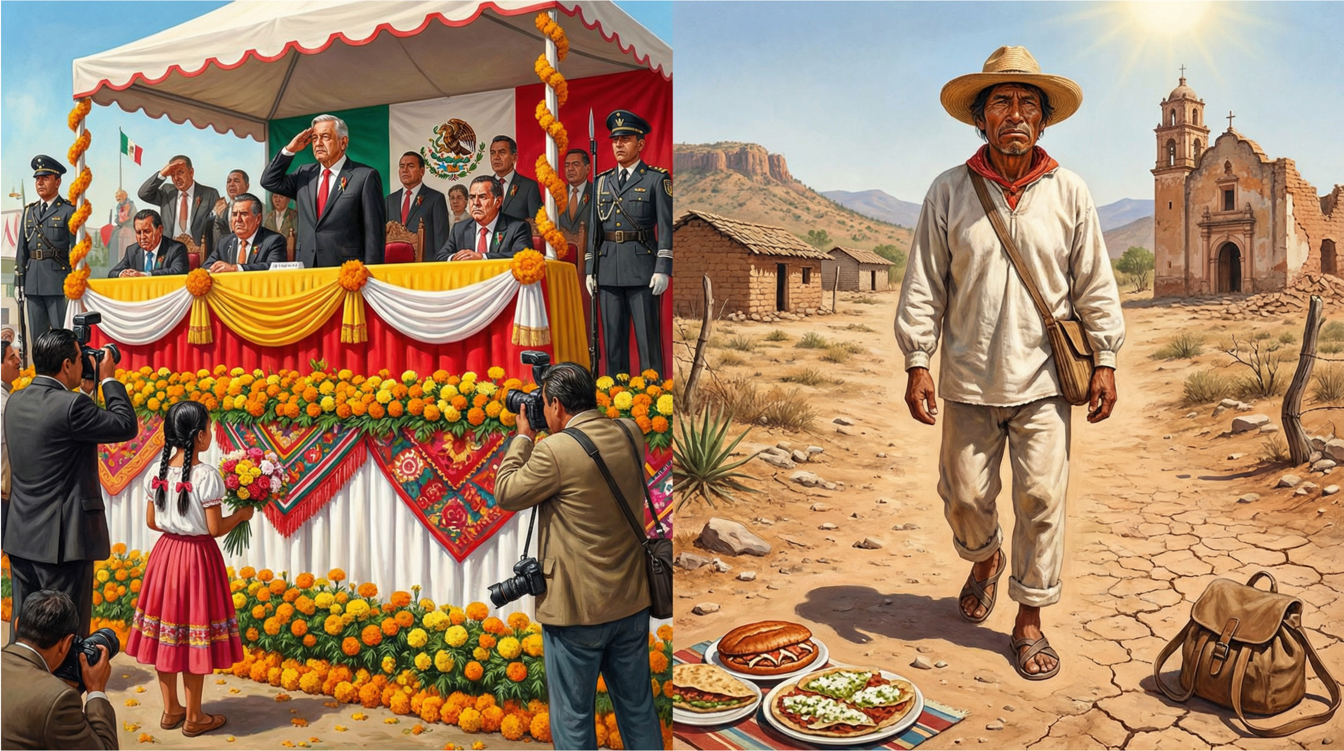 El protocolo termina, los aburguesados se saludan y se dan abrazos y besos. La gente del pueblo se apiña bajo el entoldado que se ha dispuesto con agua fresca de tamarindo, pambazos, memelas y tostadas. Sobre la fruta serpentean las manos que desaparecen en los morrales. El indio toma rumbo a su jacal. Ha comido. En su talega lleva un pambazo y tres memelas. Al día siguiente, su señora tiene diarrea y fuertes dolores de estómago. La comida se había echado a perder por el calor.