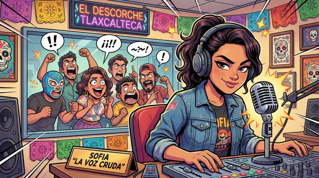 «Buenas noches, buenas noches, amantes de la información y devotos del sarcasmo. Soy Sofía ‘La Voz Cruda’ Ramírez, su guía en este viaje, a veces doloroso, a través de la realidad tlaxcalteca. Y esta noche, tenemos noticias que, bueno, digamos que necesitamos un poco de… ‘calentamiento’ para procesar.»